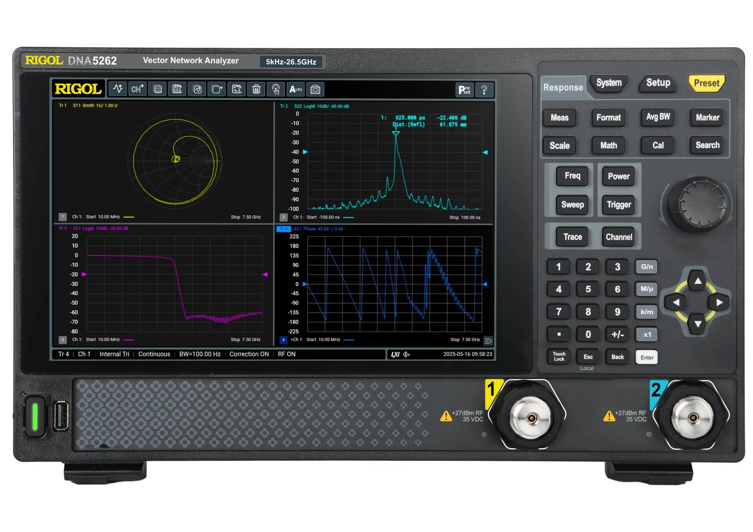 The Rigol DNA5142 2 Port, 5kHz to 14 GHz, 1 Hz Resolution Vector Network Analyser provides various calibration methods such as frequency response, single-port, response isolation, enhanced response, full dual-port, and electronic calibration. It supports various display formats such as Log Mag, Lin Mag, SWR, Phase, Group Delay, Smith Chart, and Polar Chart. Through the connectivity with the instrument under test via the standard interfaces such as USB, LAN, and HDMI, this series can accurately measure the amp/ freq characteristics, phase/freq characteristics, and group delay characteristics of the microwave network.