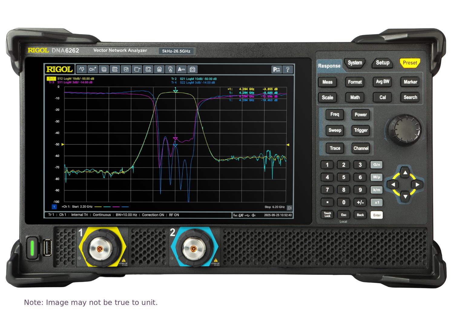 The Rigol DNA6142 vector network analyser provides various calibration methods such as frequency response, single-port, response isolation, enhanced response, full dual-port, and electronic calibration. It supports various display formats such as Log Mag, Lin Mag, SWR, Phase, Group Delay, Smith Chart, and Polar Chart. Through the connectivity with the instrument under test via the standard interfaces such as USB, LAN, and HDMI, this series can accurately measure the amp/ freq characteristics, phase/freq characteristics, and group delay characteristics of the microwave network.